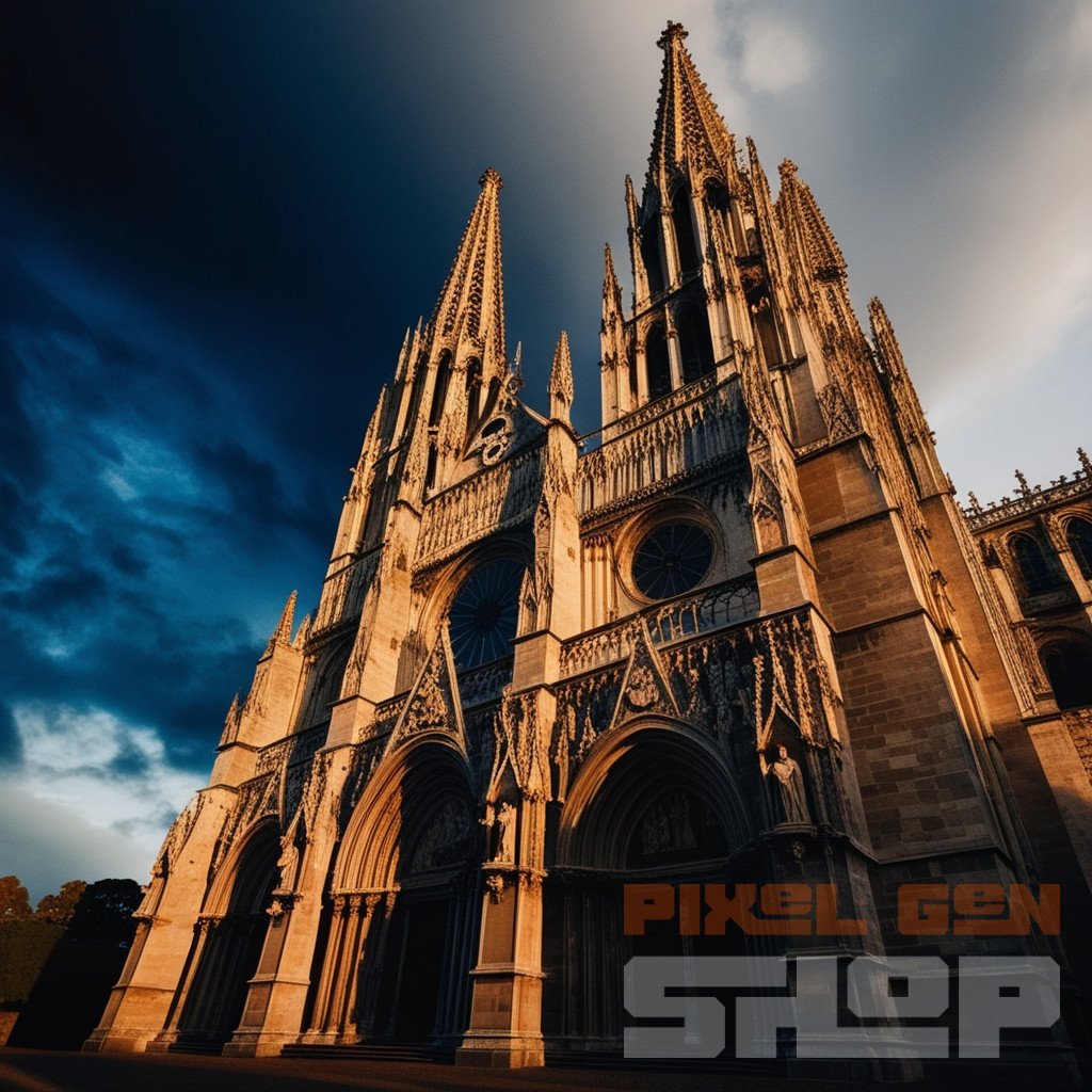 Gothic Cathedral at Sunset Under Dramatic Skies