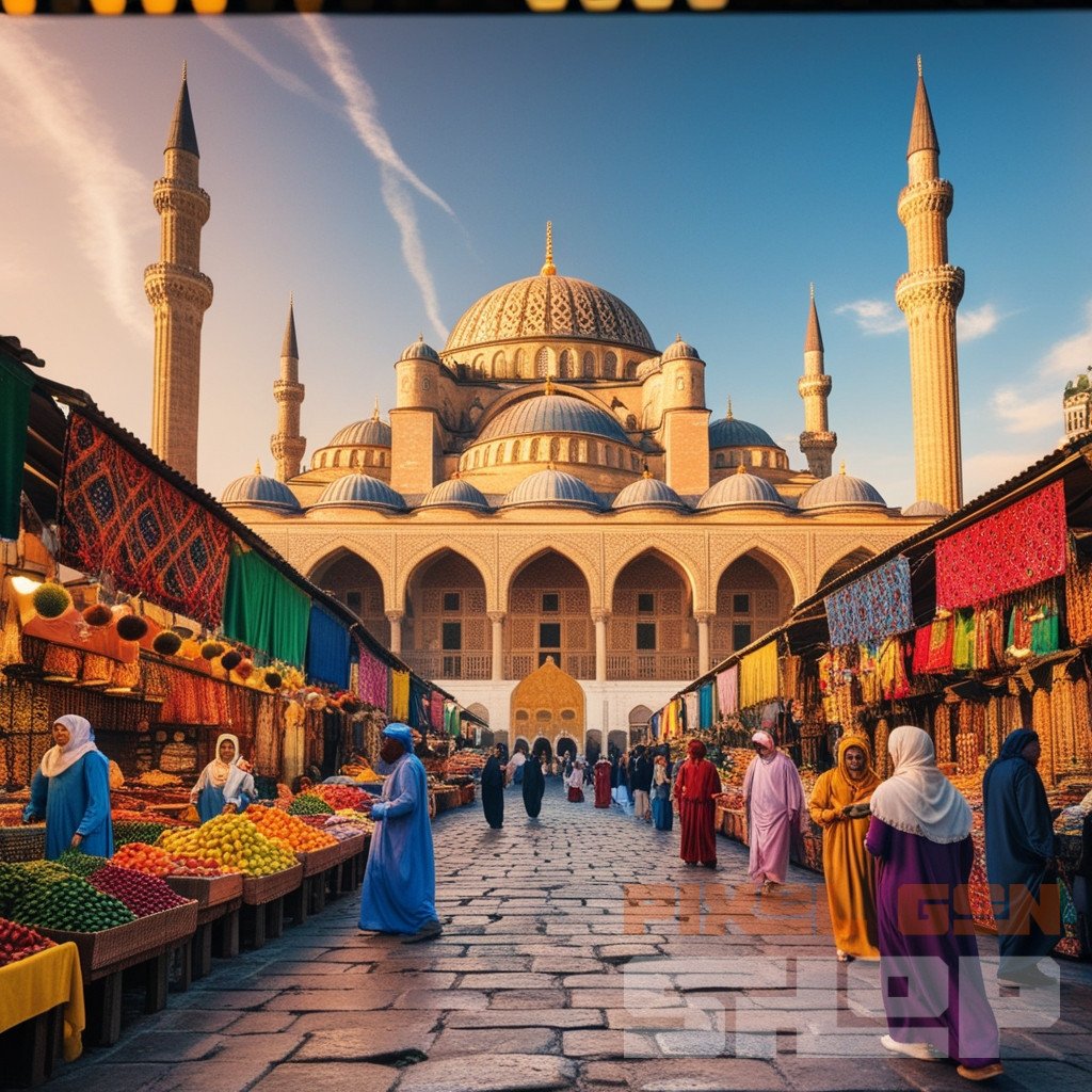 Vibrant Bazaar in Front of a Majestic Mosque