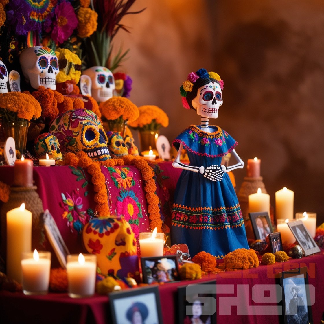 Vibrant Day of the Dead Altar with Colorful Offerings